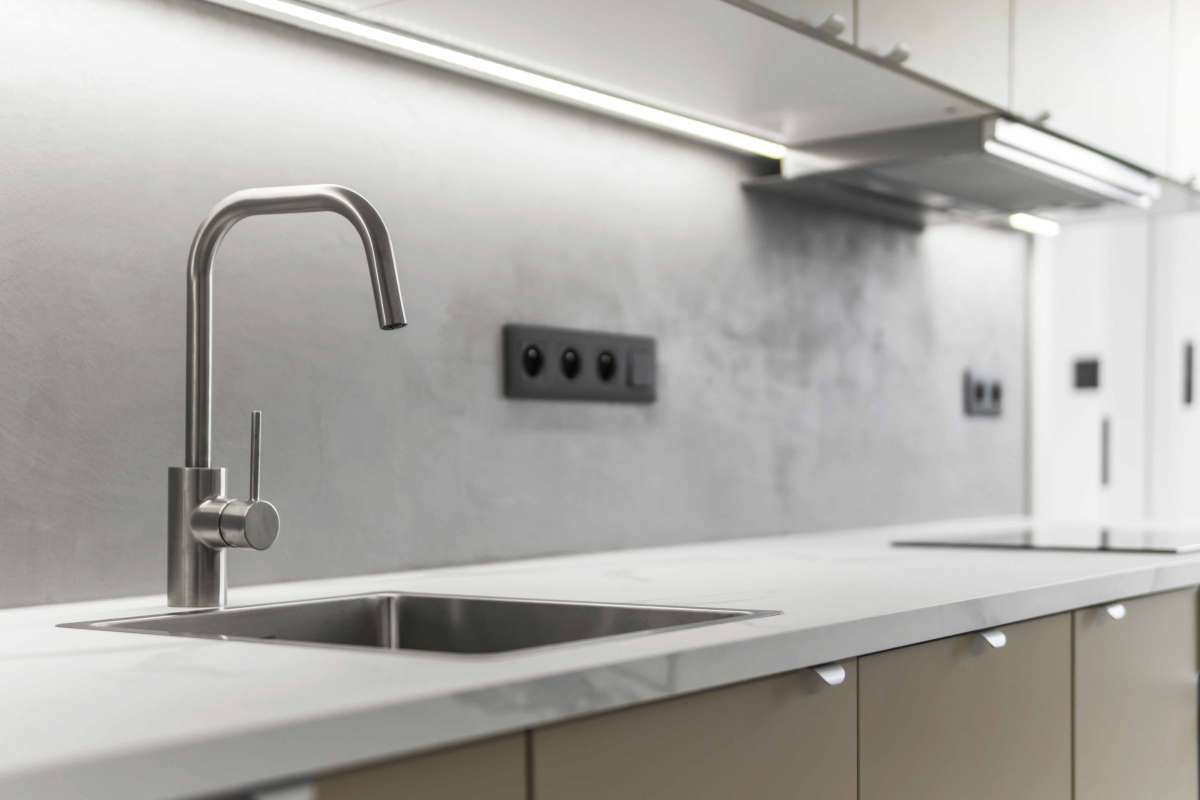 Pracovní deska je v dekoru mramoru, obklad jsme nahradili betonovou stěrkou a doplnili stříbrné detaily, které interiéru dodávají jemný nádech elegance.